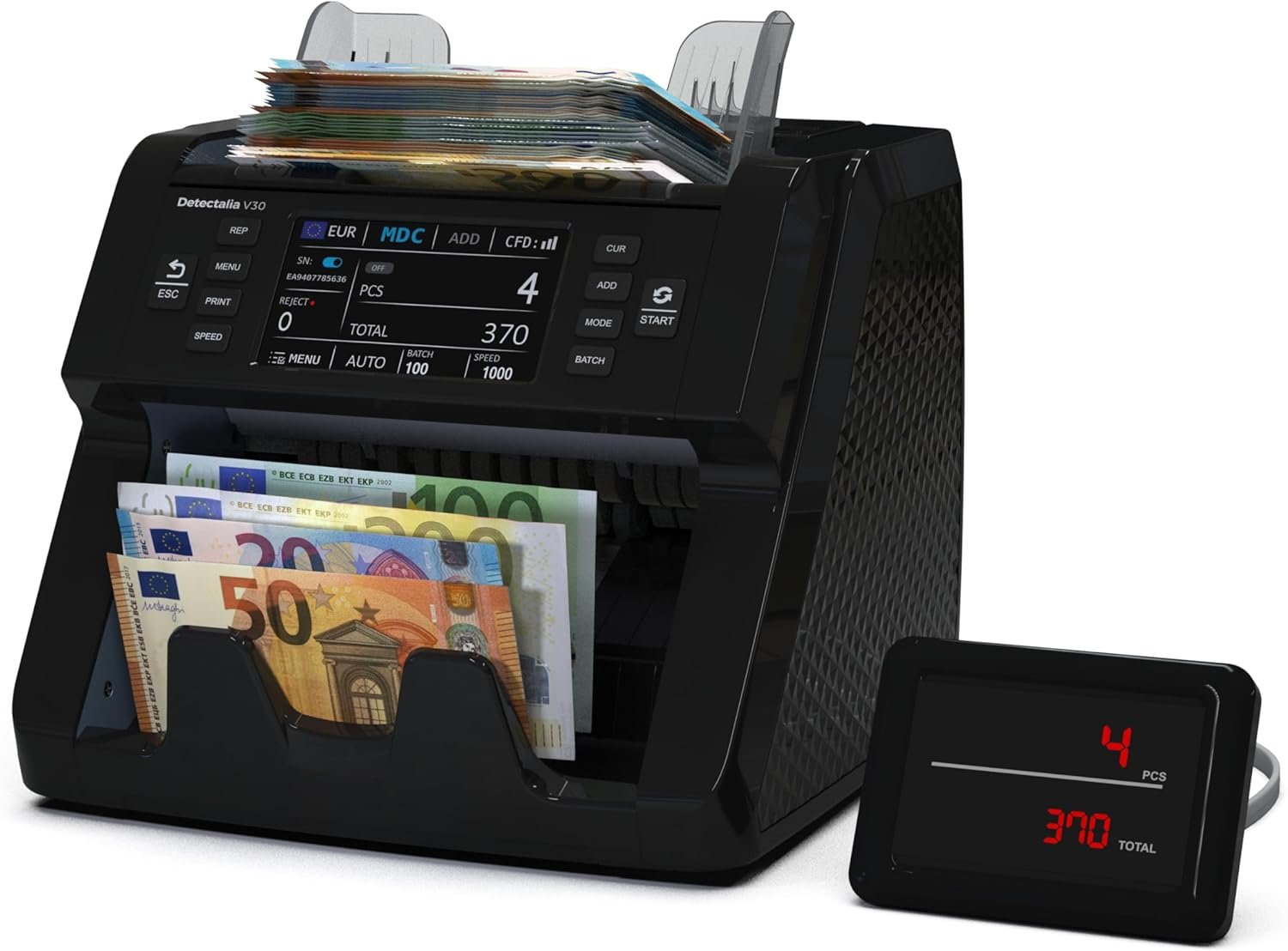 Bonvoisin Geldzählmaschine: Wertzähler für gemischte EUR-Scheine mit UV/MG/IR-Prüfung & externem Display. Profi-Zähler (1.000 Stk/Min).