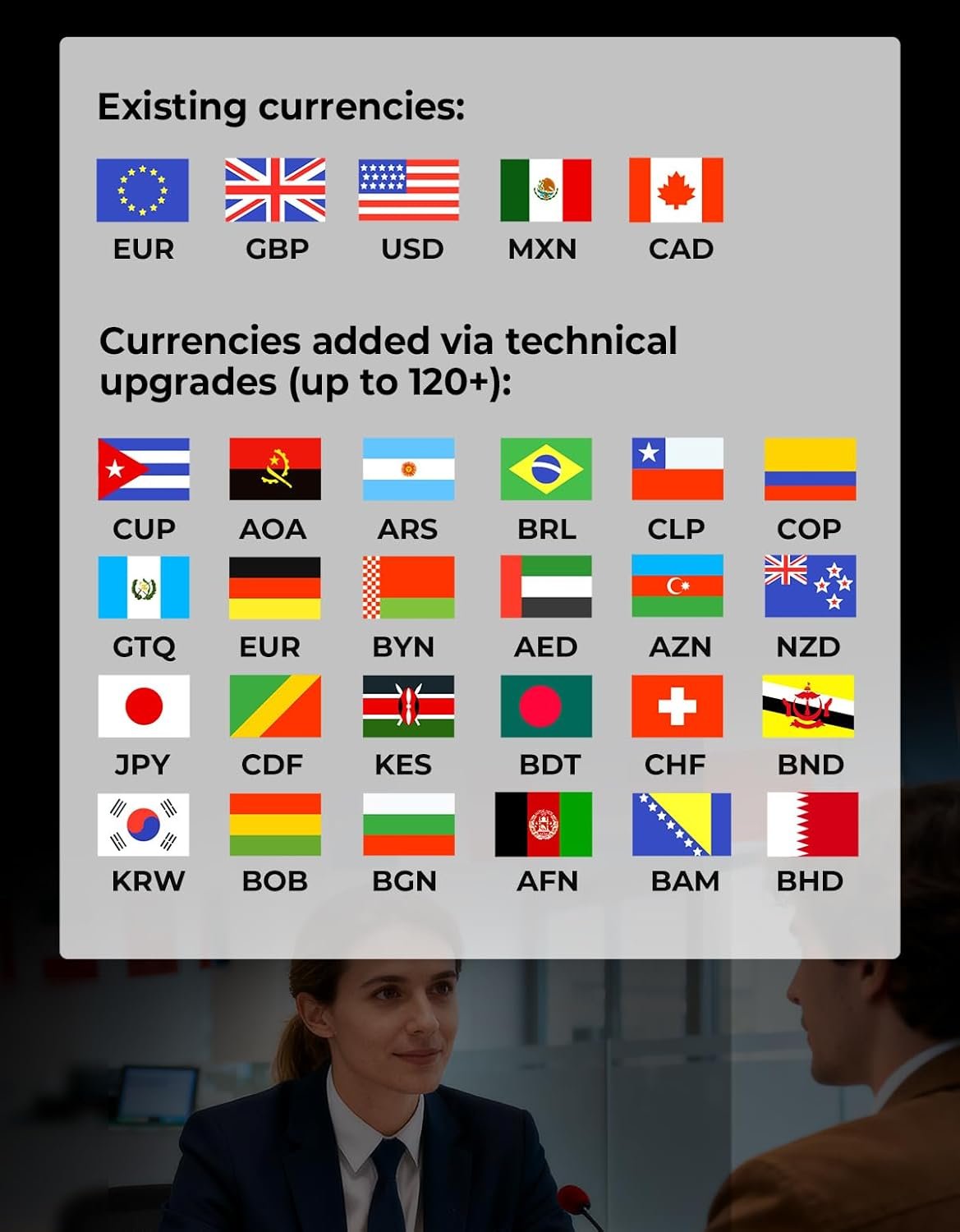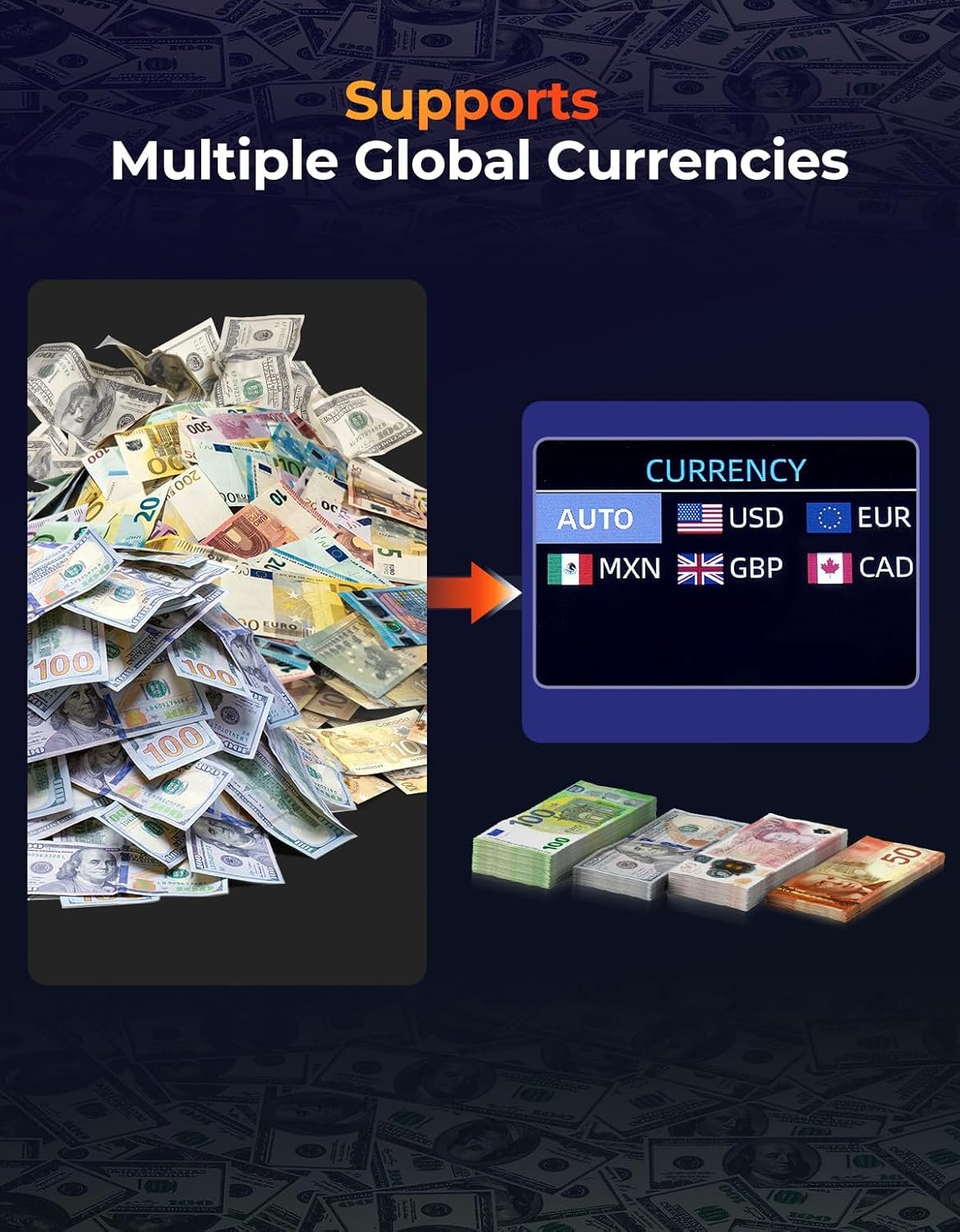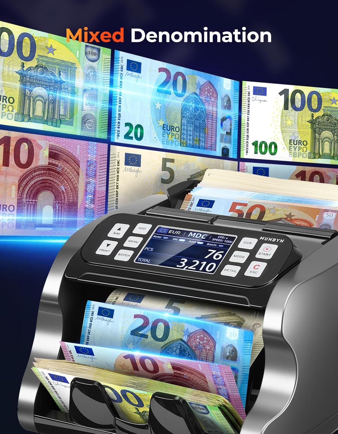 Effiziente Mischwertzählung: Im MDC-Modus ermittelt die Maschine automatisch den Gesamtwert und die Anzahl verschiedener Stückelungen. Unterstützt Multi-Währungen wie EUR, USD, GBP, MXN und CAD.