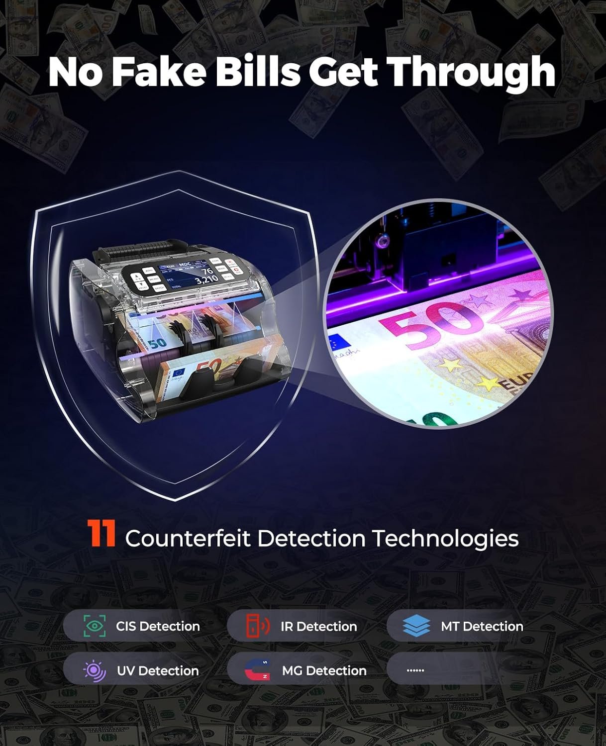 Sicherheit auf Bankenniveau: Maximale Sicherheit durch 11 integrierte Prüfmethoden, darunter CIS, UV, MG, IR und MT. Jede Banknote wird mittels Magnettintenprüfung und Infrarotanalyse auf Echtheit geprüft.