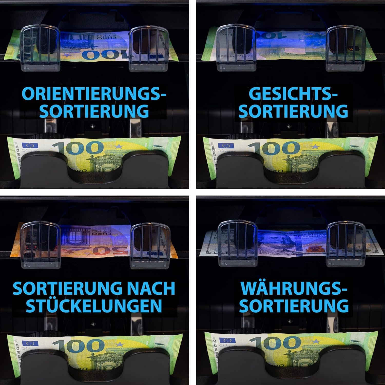Fortschrittliche Bargeldverarbeitung: Das Gerät zählt bis zu vier Währungen gleichzeitig und erfasst Seriennummern. Unterstützt die Mischzählung für EUR, USD, GBP, CHF, SEK, PLN und viele weitere. EZB-zertifiziert für höchste Sicherheitsstandards.