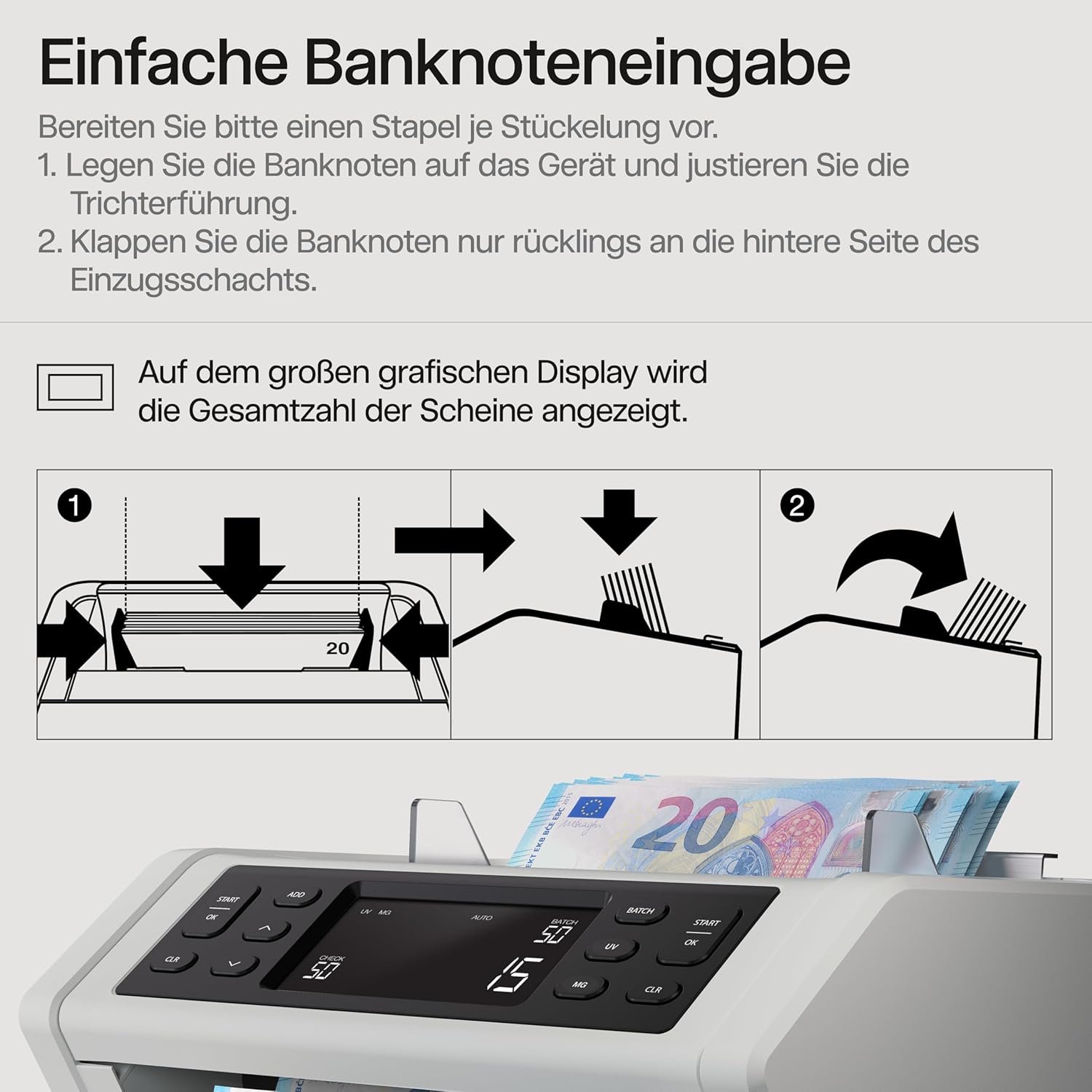 Klare Ergebnisanzeige: Nach Abschluss der Zählung zeigt das Display die exakte Gesamtmenge der Banknoten an. Der Gesamtwert lässt sich durch einfache Multiplikation mit dem Nennwert der sortierten Scheine ermitteln.