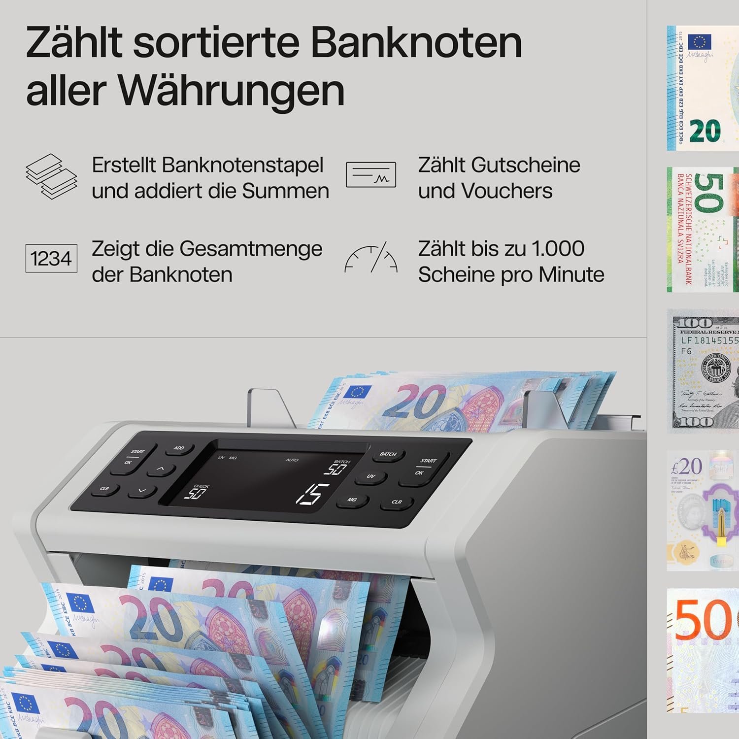 Zeitsparende Additions- & Batchfunktion: Nutzen Sie die Add-Funktion, um Ergebnisse über mehrere Zähllayouts hinweg zu summieren, oder die Stapelfunktion (Batch), um exakte Banknotenbündel für die Wechselgeldkasse vorzubereiten.