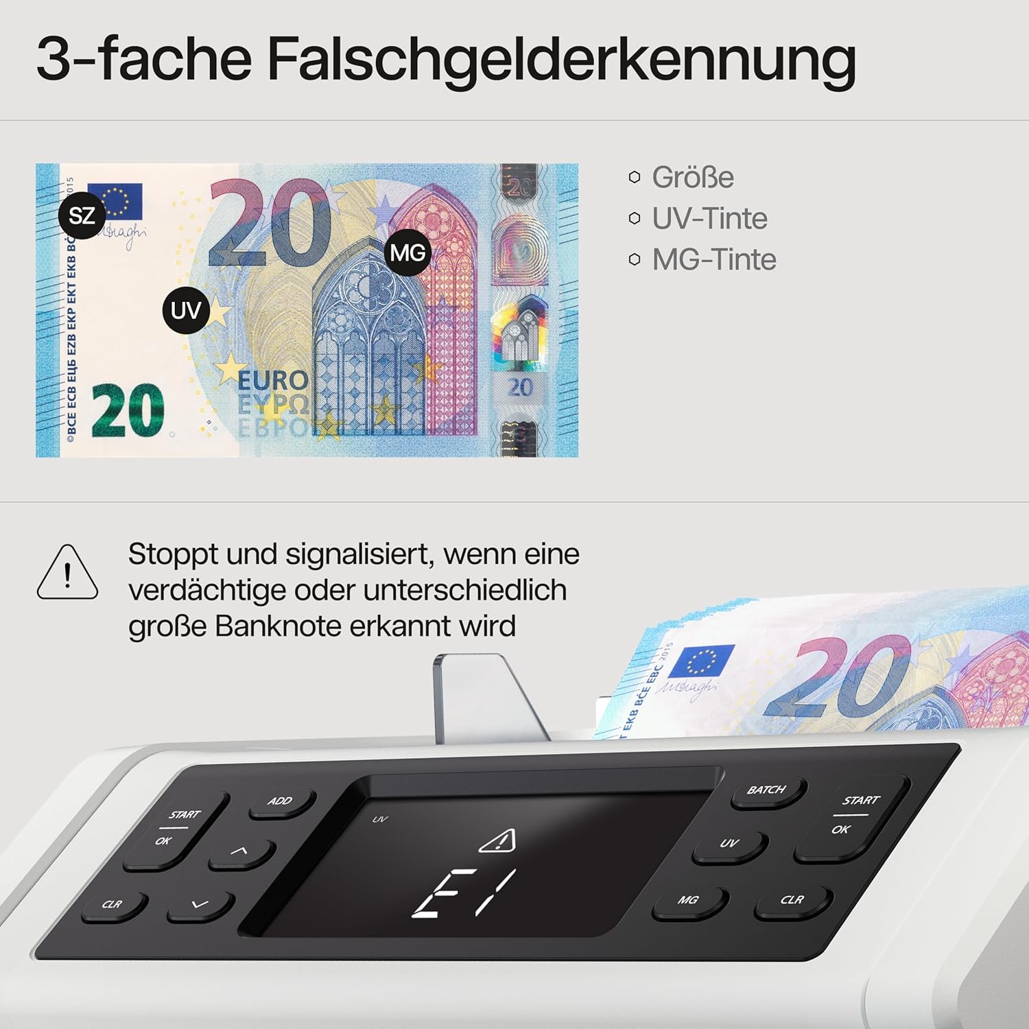 3-fache Echtheitsprüfung: Schützen Sie Ihr Unternehmen vor Falschgeld. Das Gerät scannt Banknoten innerhalb von Sekunden auf UV-Tinte, magnetische Merkmale und die Größe. Bei Unregelmäßigkeiten stoppt der Zählvorgang automatisch für eine manuelle Kontrolle.