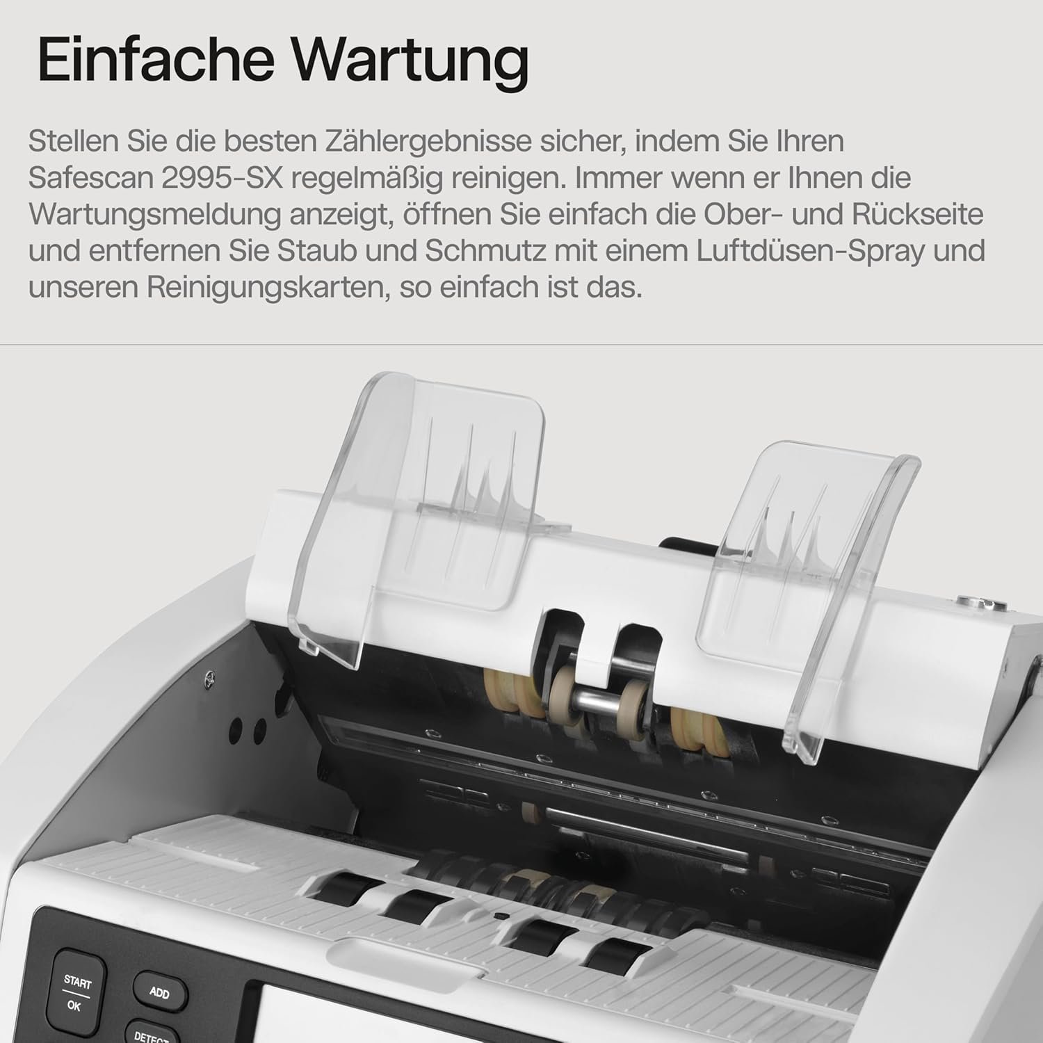 Fitness-Sortierung & ATM-Vorbereitung: Dank des intelligenten Doppelfach-Designs sortiert der Safescan 2995-SX Banknoten nach Zustand, Ausrichtung oder Nennwert. Verschmutzte, zerrissene oder beschädigte Scheine werden automatisch gefiltert – ideal für die Vorbereitung von Geldautomaten und Bankeinlagen.